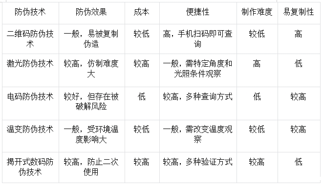 为了更直观地了解各种防伪技术的特点,我们可以从多个维度进行对比分析,以下是一个简单的对比表格: